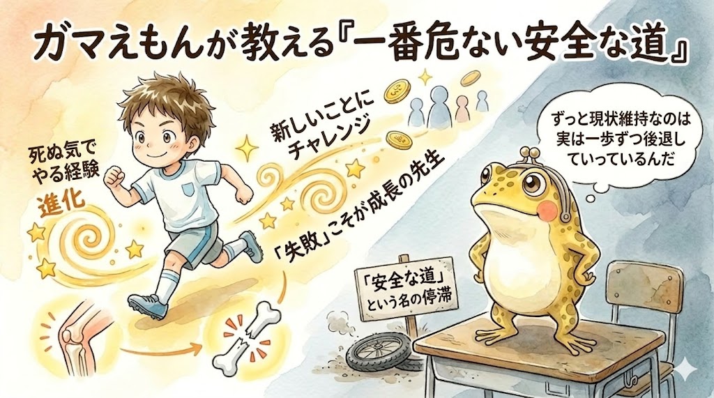 ガマえもん:「それはね、ケンタくん。実はこの世で一番『危ない』のは、ずっと安全な場所にいようとすることなんだよ。お金も人も、実はちょっと『危なっかしい人』のところに集まるようになってるんだ」