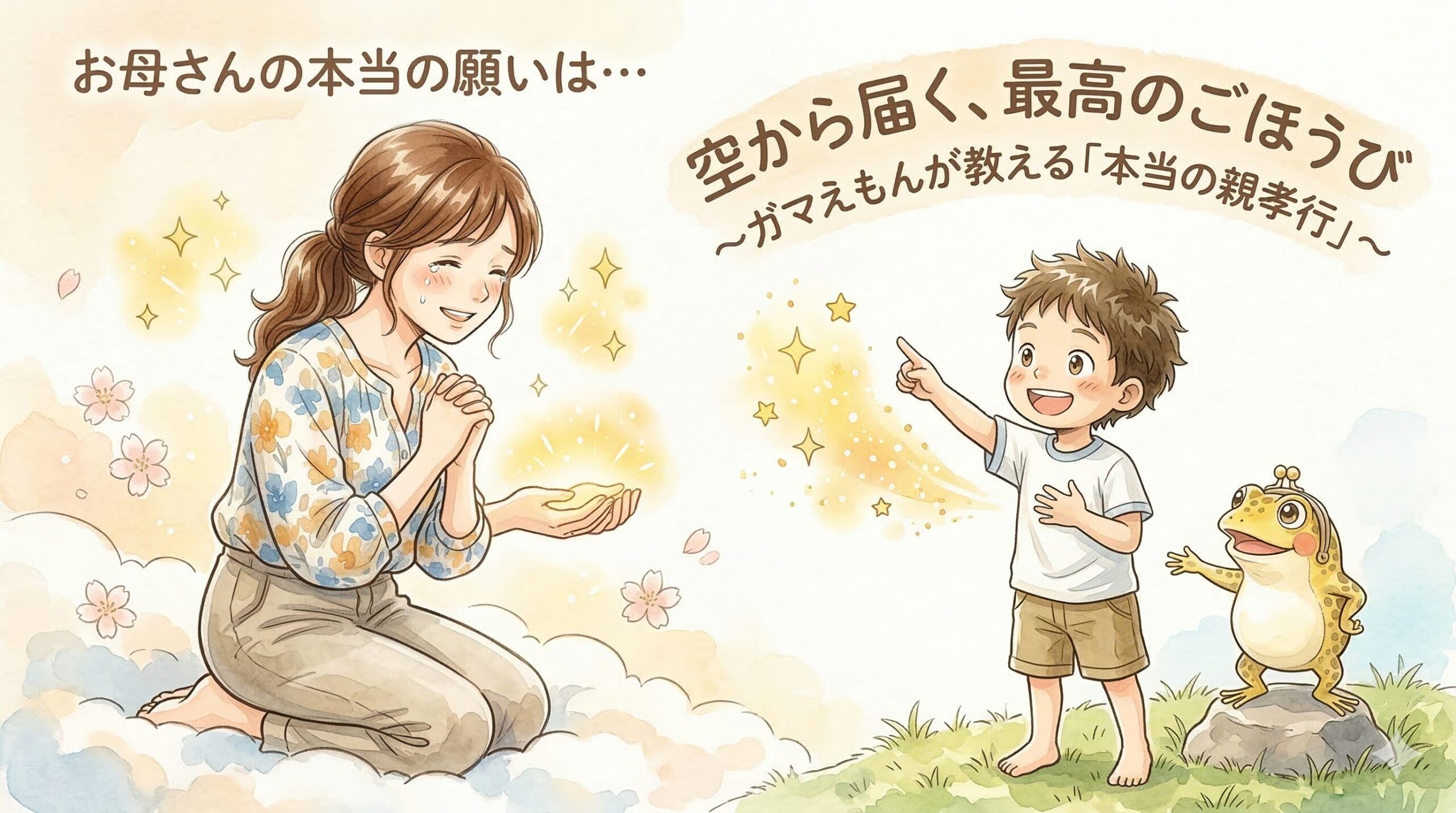 ガマえもん:「そう。有名になったりお金持ちになったりすることよりも、ケンタくんが心から笑って、毎日を楽しく過ごしている姿を見せること。それこそが、お母さんへの一番の『ありがとう』になるんだ。お母さんにとって、君の笑顔はどんな宝石よりもキラキラ輝くごほうびなんだからね。」