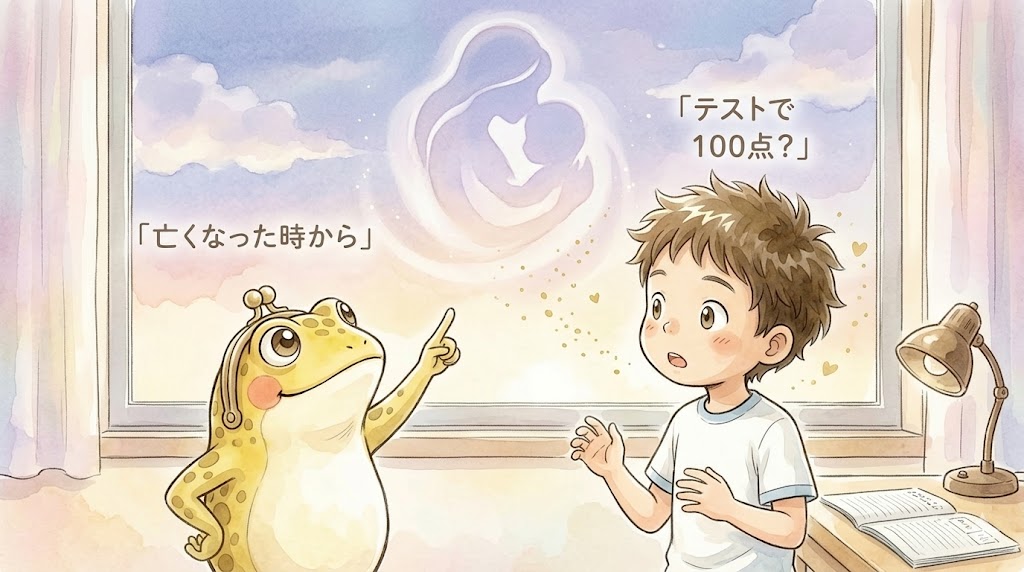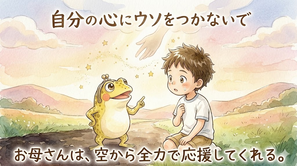 ガマえもん:「その通り!だからね、感謝の気持ちを伝えるのに『もう遅い』なんてことはないんだ。お母さんが空へ行った後でも、君が自分の心に正直に、一生懸命に人生を楽しむこと。それが、お母さんへの最高のプレゼントになるんだよ。」