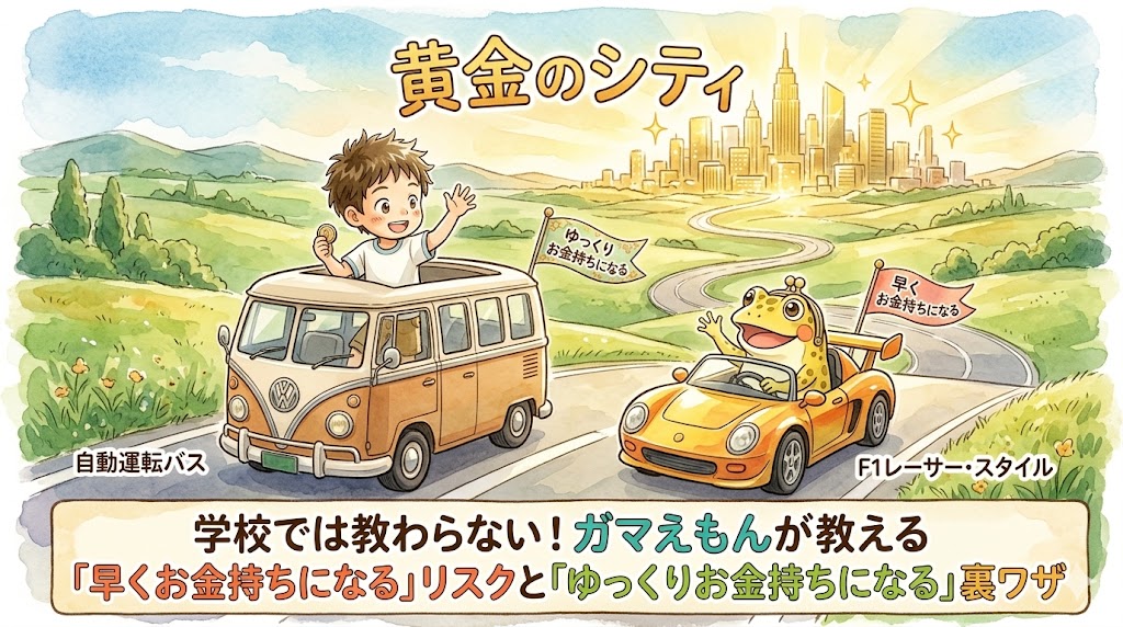 ガマえもん:「このバスのすごいところは、『複利(ふくり)』という名前の魔法の自動運転(雪だるま式に、どんどん増えていく魔法)がついていること。最初にチケット(毎月の貯金や投資)を買って座席に座っちゃえば、あとは勝手に進んでくれる。運転はロボットにお任せだから、車内では友達とおしゃべりしたり、窓の外に広がる『学校生活』や『家族との旅行』っていう今しか見られない景色を全力で楽しむ余裕があるんだ。特別な才能がなくても、時間はかかるけどいつかは必ず『黄金のシティ』に着ける、いちばん確実なルートだよ。」