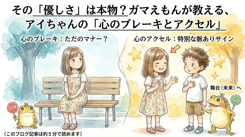 ガマえもん:「例えばね、ケンタくんが話しているとき、アイちゃんは体ごとこっちを向いてるかな?もし、スマホをいじりながら『ふーん』って言ってるだけなら、それはただの礼儀。でも、もしスマホを裏返して置いて、ケンタくんの話に身を乗り出しているなら、それは舞台に上がっている証拠(しょうこ)だよ。」