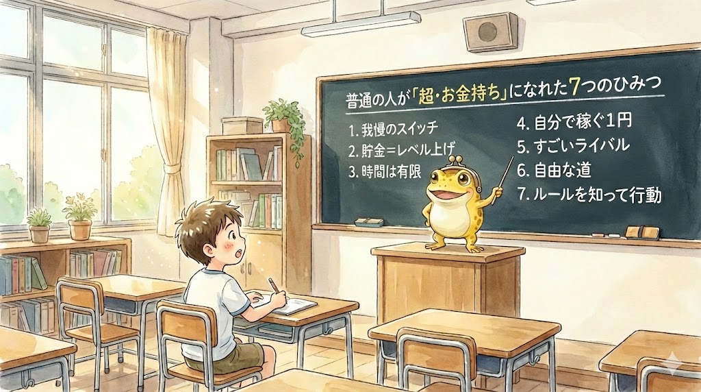 ガマえもん: 「ケンタくん、今日の特別授業を始める!今日のテーマは、ズバリ『普通の人が、たった10年で一生困らないくらいのお金を貯めたひみつ』だ!」